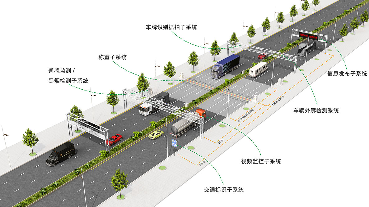新凌志非现场执法不停车超限检测系统,由前端感知系统与治超管理平台组成。其中前端感知系统由动态称重子系统、车牌识别抓拍子系统、视频监控子系统、信息发布子系统、交通标志子系统等多个子系统有机集成,形成一条完整的违法车辆信息链条,建立起一个全天候车辆超限超载违法行为监控网络。该系统围绕道路事件检测和超限超载治理两大核心目标,建设公路业务分中心业务处理系统,完成对道路超限超载车辆、道路突发事件的实时监控检测、超限超载行为的治理和综合管理,提升公路局(运输局)的执法效率和公众服务水平。